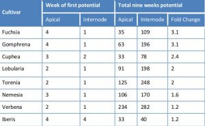 Three apical or secondary cuttings from the designated crops were planted. Potential was assessed once a week for each plant. Measurement was conducted for 9 weeks. Average weekly potential for each of the cuttings types of each crop is presented. Ratios are calculated as the potential of internode cuttings divided by the potential of apical cuttings.
