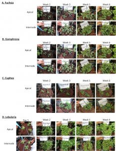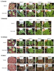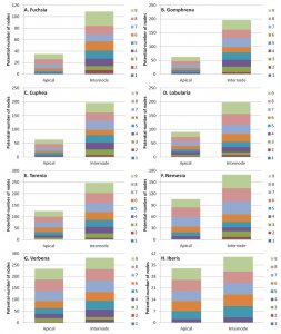We were able to show that the potential of internode cuttings was higher for the examined crops (See table 1 and figure 1). The following crops showed increased potential when planting secondary cuttings: Fuchsia (X3.1 compared to apical cuttings-See figure 2A), Gomphrena (X3.1 compared to apical cuttings-See figure 2B), Cuphea (X2.4 compared to apical cuttings-See figure 2C), Lobularia (X2 compared to apical cuttings-See figure 2D), Torenia (X2 compared to apical cuttings-See figure 2E), Nemesia (X1.6 compared to apical cuttings-See figure 2F), Verbena (X1.2 compared to apical cuttings-See figure 2G), Iberis (X1.2 compared to apical cuttings-See figure 2H). For Lobularia, Torenia, and Gomphrena this increased potential was also characterized by longer and more branched roots (See figure 3).